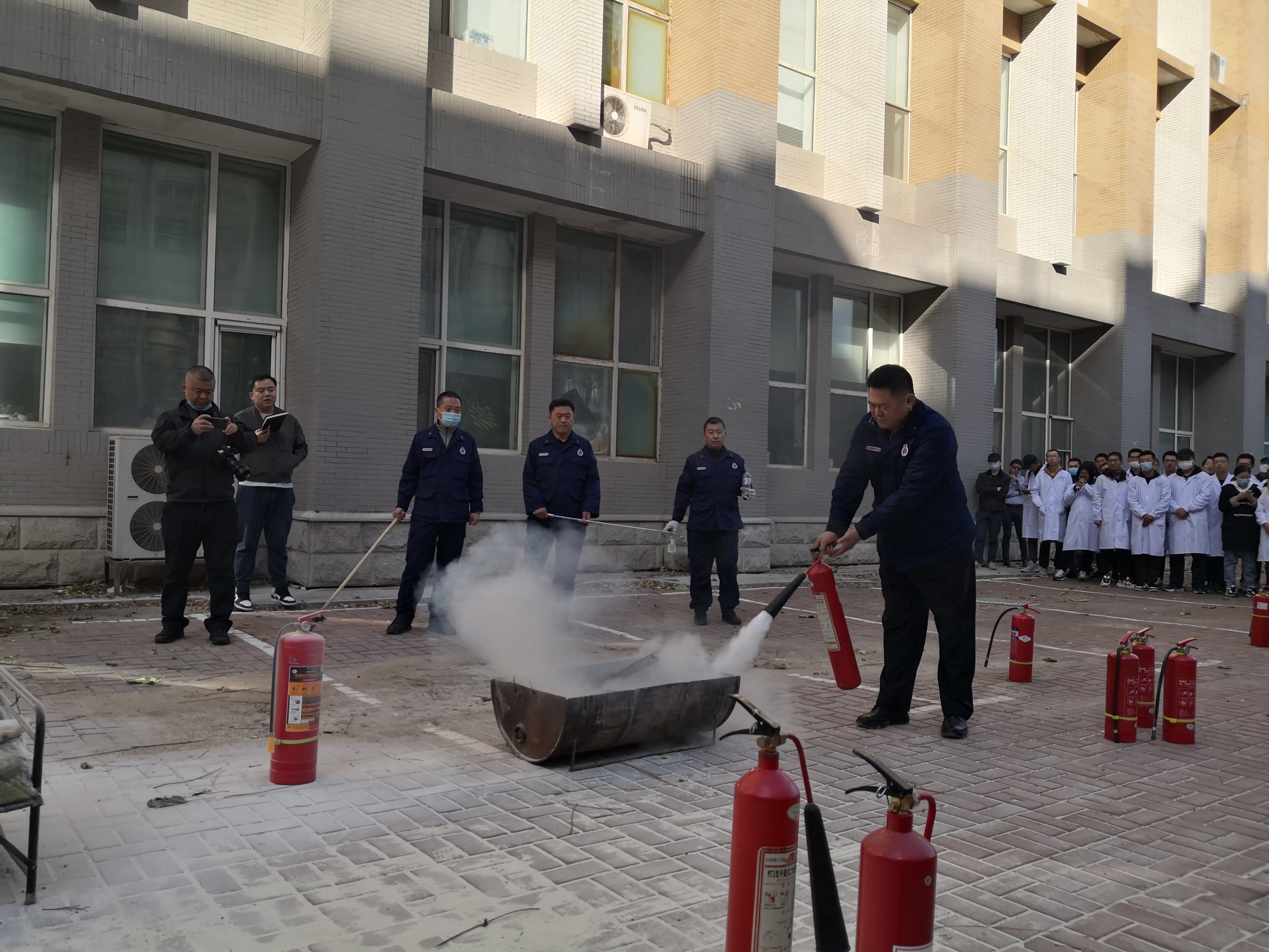 全体师生安全疏散完毕后,校保卫处消防科负责人董立明老师对全体师生从如何报火警、火灾的预防、电气火灾、火场自救及逃生方法等消防安全基本常识进行了讲解,并演示了干粉灭火器、二氧化碳灭火器、水基型灭火器、防火毯的使用方法和操作要领。师生们踊跃进行现场消防器材使用操作练习。