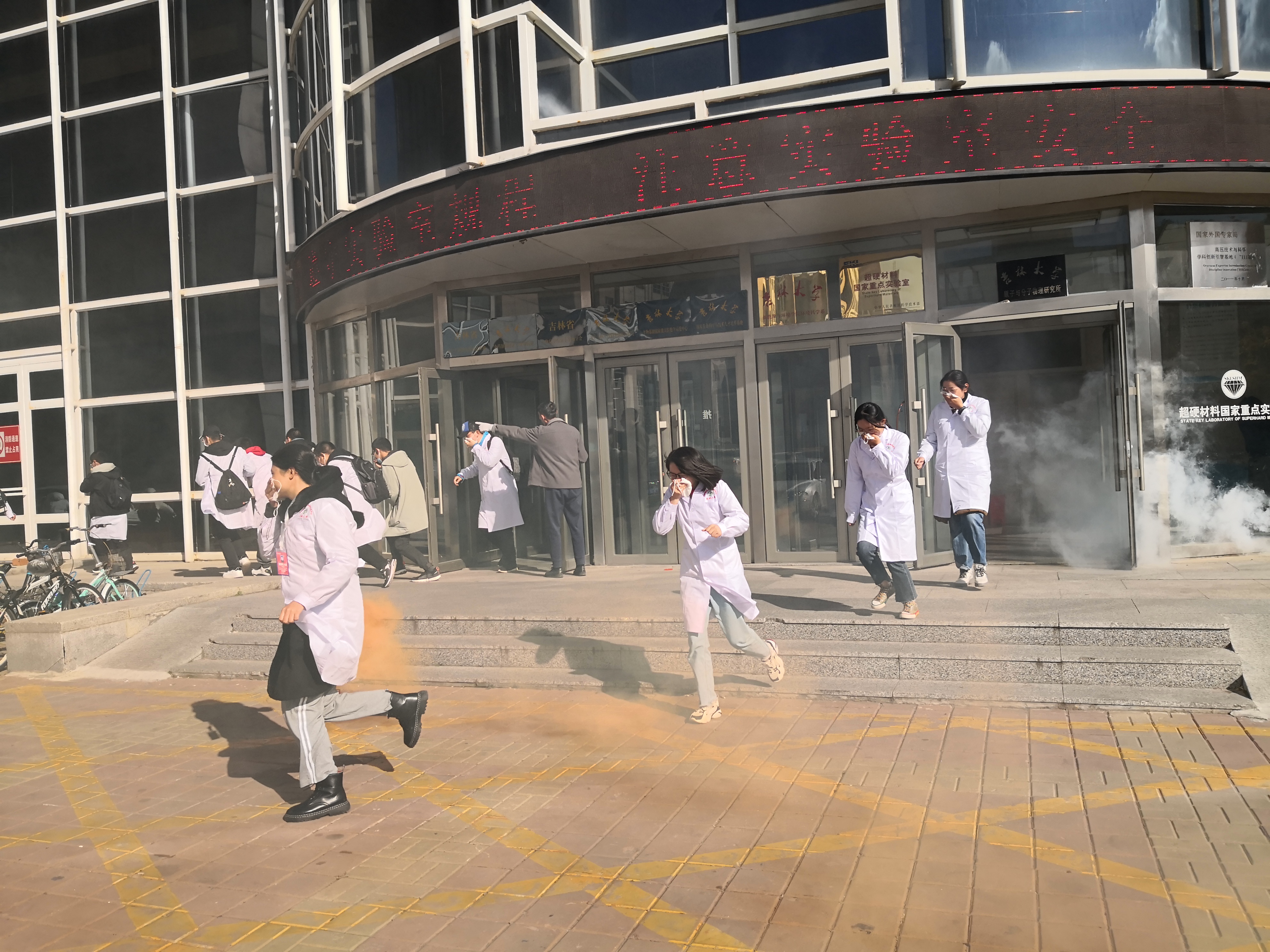 消防演习于下午13点30分伴随着报警器的“突然”响起和实验楼滚滚浓烟正式开始。实验室工作的本科生、研究生和教师,立刻放下手中工作,在相关安全负责人的指挥下,迅速关闭电源,拿出毛巾、口罩沾水唔上口鼻,有序的撤离实验室,并沿消防指示灯指示方向迅速下楼、在就近防火门通道到达安全地带。随后各班班长、各楼层负责人清点人数,并层层汇报。在发现有被困人员时,总指挥派人前去救助,并安全救出。