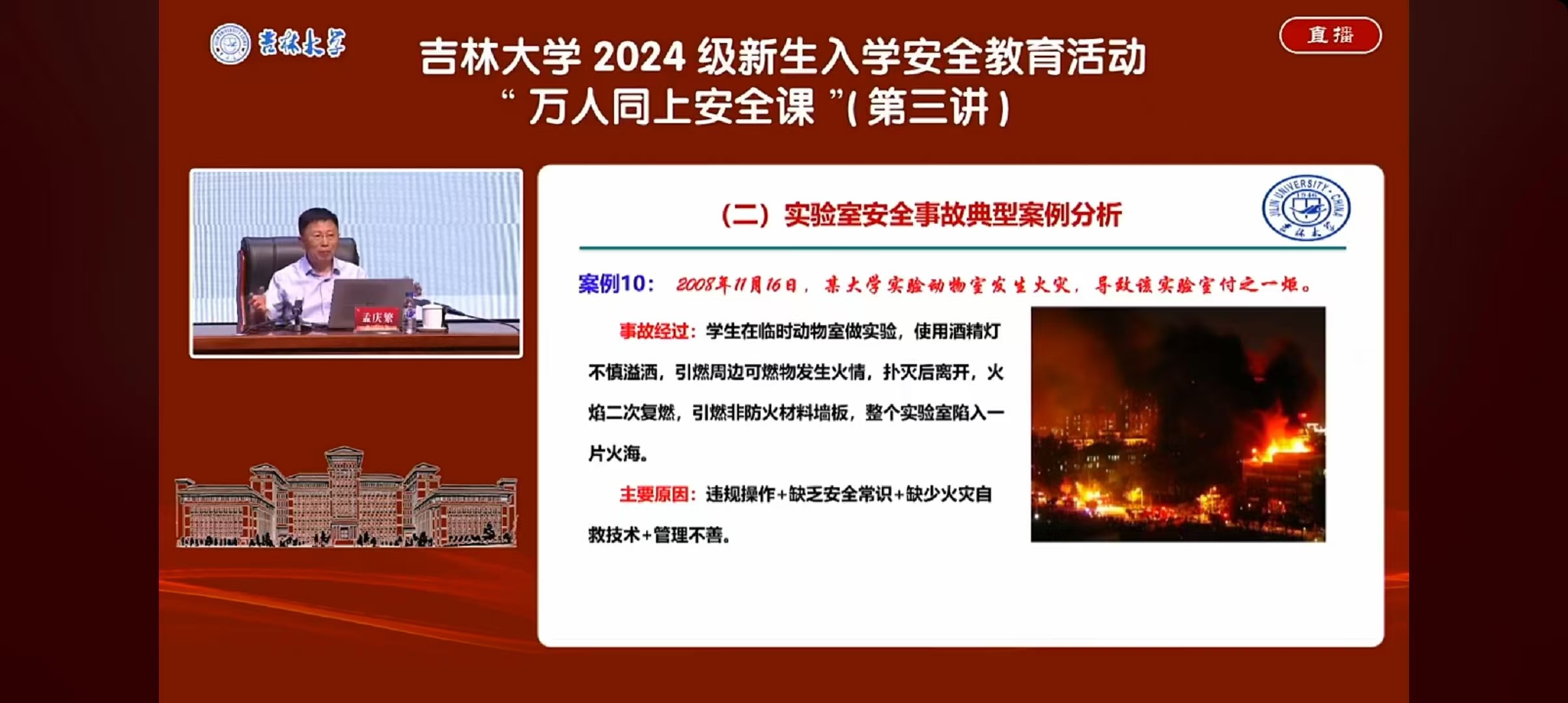 中心副主任孟庆繁应邀做“高校实验室安全之问”主题讲座,他从“为什么党和国家高度重视实验室安全工作?”“实验室安全事故频发的主要原因是什么?”和“要保证实验室安全需要我们怎么做?”等三方面,通过大量的实验室安全事故典型案例,分析了实验室安全事故发生的原因,并通过要求学生从“做到‘3个掌握’、提高‘3种意识’、养成‘6种习惯’”来提高实验室安全素养。讲座现场多次想起喝彩掌声,“线上”1.6万多人次点赞。